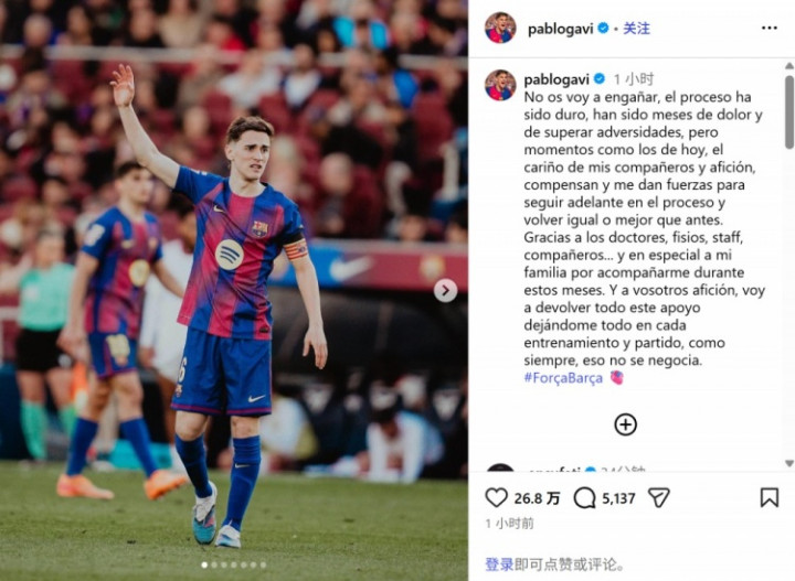 在社交媒体上,加维写道:经历了数月的痛苦与挑战,我终于迎来了今天的复出时刻。队友们和球迷们的关爱让我深受感动,也给了我继续前进的力量。感谢医生、理疗师、工作人员以及我的队友们,特别要感谢我的家人在这段时间里的陪伴。对于球迷朋友们的支持,我会用每一次训练和比赛中的全力以赴来回报你们,这是毋庸置疑的。加油巴萨!